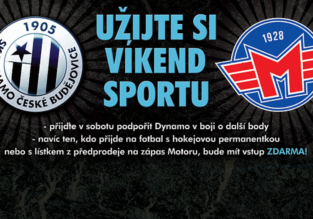 Následující víkend na jihu Čech bude ryze sportovní. Fotbalisté Dynama doma přivítají v sobotu od 17:00 v SYNOT lize čtvrtý tým soutěže 1. FC Slovácko a v neděli ve stejný čas se v Budvar Areně odehraje utkání 3. kola první hokejové ligy mezi Motorem a Rebelem Havlíčkův Brod. Zástupci obou jihočeských klubů se stejně jako na jaře dohodli na vzájemné spolupráci, díky které budou moci jít příznivci Motoru na zápas Dynama zdarma! "Naše společná akce z jarní části sezony, kdy jsme hráli doma s Hradcem a Motor se Šumperkem sklidila úspěch. Na zápas dorazilo téměř pět set fanoušků hokeje a budeme rádi, když tentokrát jich na zápas SYNOT ligy dorazí ještě více," říká generální manažer Dynama Karel Poborský.