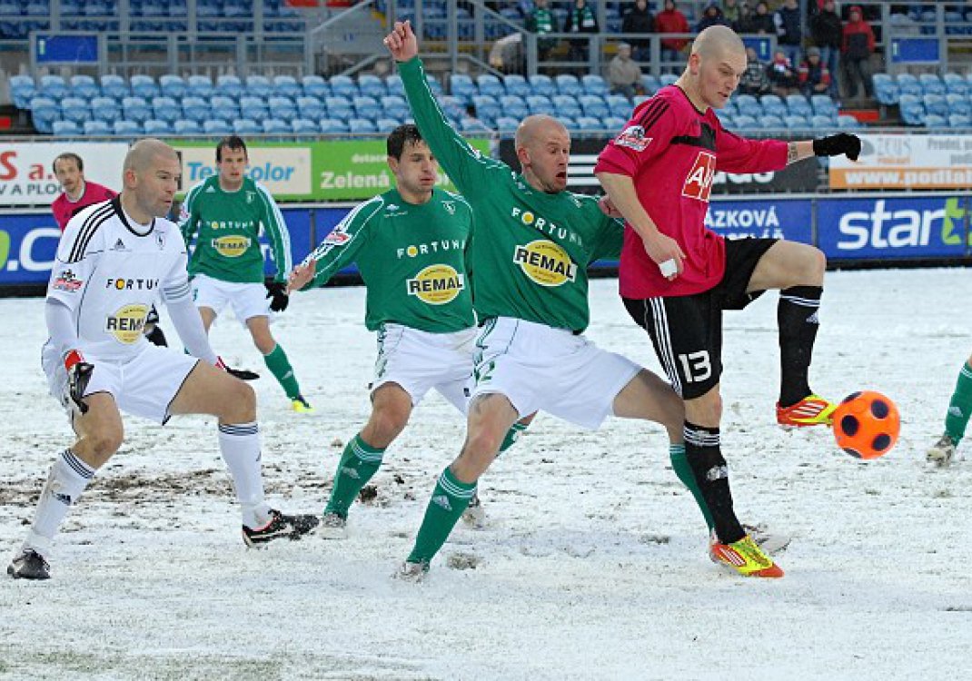 Filip Rýdel ve středu hřiště vyslal ukázkovou přihrávku na rozběhnutého Michala Klesu, pro něhož nebyl problém utéct obránci Jindřiškovi a křížnou střelou překonat brankáře Sňozíka - 1:0. Po pár minutách hustého sněžení se hrací plocha změnila v souvislou zasněženou plochu a rozhodčí Drábek nařídil prohrnutí alespoň základních čar. Na řadu přišel i speciální oranžový míč.