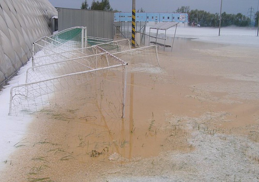 Málokdo asi něco podobného během srpna zažil. Během několika málo minut vypadalo Složiště jako po zásahu vyšší moci. Kroupy o velikosti golfových míčku zničily slunečníky, reklamní plachty a poničili také přetlakovou nafukovací halu. Dvě travnatá hřiště byla navíc zaplavená vodou, na hrací ploše místy stálo i padesát centimetrů vody. Přestože bylo po bouřce relativně teplo, kroupy tály velmi pozvolna a navíc na hrací plochy stále přitékala další voda z okolních polí.