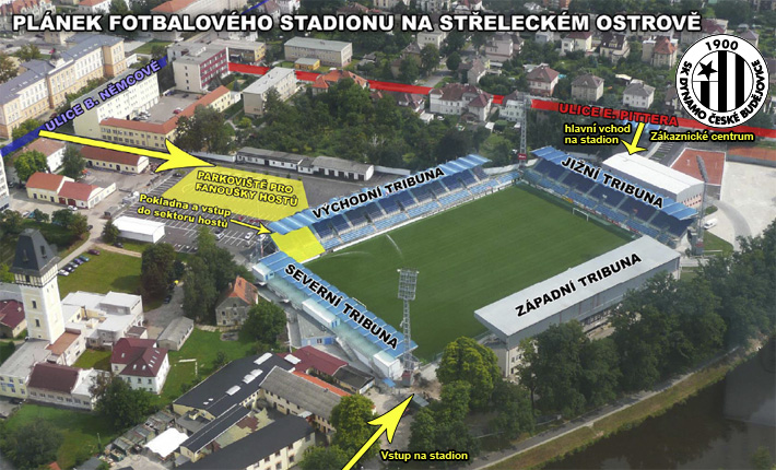 Adresa stadionu je Střelecký ostrov 3, České Budějovice.